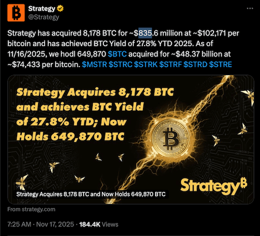 Strategy ของ Michael Saylor กลับมาสร้างเสียงฮือฮาอีกครั้ง หลังยื่นรายงาน SEC ว่าได้เข้าซื้อ Bitcoin เพิ่มอีก 8,178 BTC ถือเป็นการกลับมาซื้อล็อตใหญ่อย่างมีนัยสำคัญ เทียบกับช่วงเดือน ต.ค. และต้น พ.ย. ที่ซื้อเพียงสัปดาห์ละ 400-500 เหรียญ
