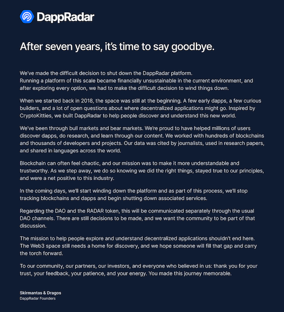 ข่าวช็อกวงการ DApp เมื่อ DappRadar แพลตฟอร์มวิเคราะห์ข้อมูลที่เปิดให้บริการมา 7 ปี ประกาศยุติการให้บริการ โดย Skirmantas Januškas และ Dragos Dunica ผู้ร่วมก่อตั้ง ให้เหตุผลว่าไม่สามารถแบกรับภาระทางการเงินได้ในสภาพแวดล้อมปัจจุบัน