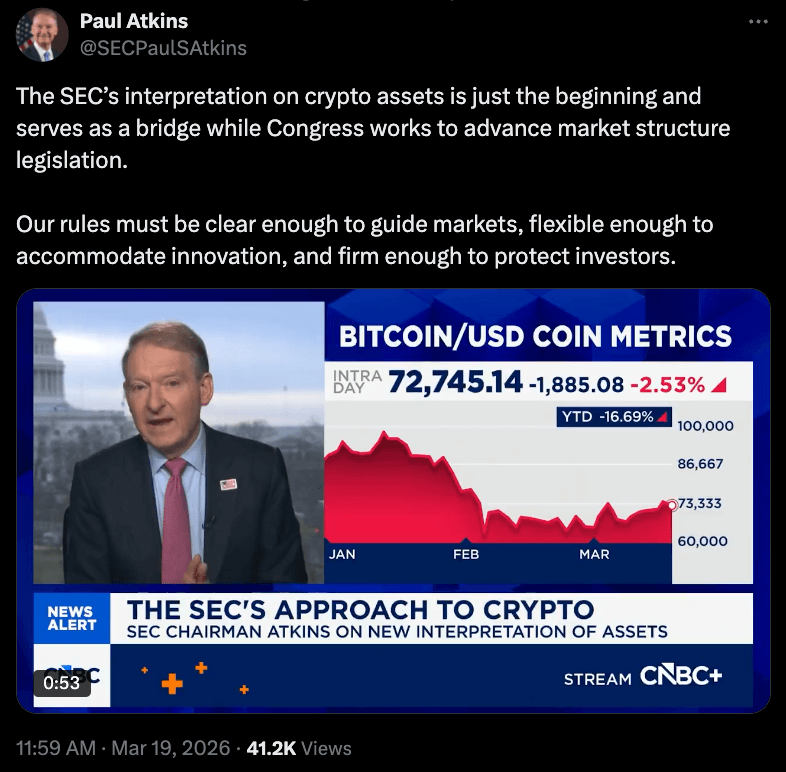 ใครที่เบื่อการใช้กฎหมายไล่ทุบของ SEC น่าจะใจชื้นขึ้น เพราะ Paul Atkins ประธาน SEC ออกมาเคลียร์ชัดเจนว่ายุคของการจัดระเบียบด้วยการบังคับใช้กฎหมายแบบเก่ากำลังจะหมดไป เขาเน้นย้ำว่าการตีความกฎหมายใหม่นี้เป็นแค่จุดเริ่มต้น ไม่ใช่จุดจบ โดยสรุปใจความได้ว่าคริปโตส่วนใหญ่ไม่ใช่หลักทรัพย์ ยกเว้นกลุ่มสินทรัพย์ดั้งเดิมที่ถูกแปลงเป็นโทเคน