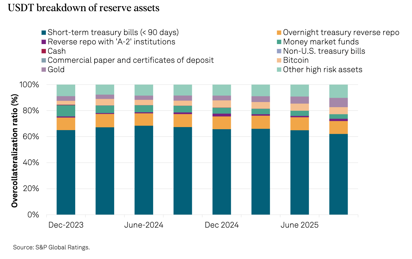 S&P Global Ratings ตัดสินใจลดคะแนนความน่าเชื่อถือของ USDT ลงสู่ระดับต่ำที่สุดในเกณฑ์วัดเสถียรภาพ โดยให้เหตุผลว่า Tether มีความเสี่ยงจากการนำสินทรัพย์ที่มีความผันผวนสูงอย่าง Bitcoin ทองคำ และหุ้นกู้เอกชนมาใช้ค้ำประกันมูลค่าเหรียญ แทนที่จะเป็นเงินสดล้วนๆ ซึ่งทาง S&P มองว่าหากราคา Bitcoin ร่วงหนัก อาจกระทบต่อความมั่นคงของเหรียญได้ทันที