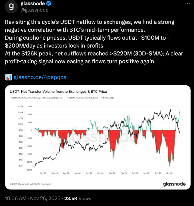 ข้อมูลเชิงลึกจาก Glassnode และ Whale Alert เปิดเผยความสัมพันธ์ที่น่าสนใจและอาจเป็นสัญญาณเตือนนักเทรด โดยพบว่าราคากับกระแสเงินทุนของ USDT มีความสัมพันธ์ในทิศทางตรงกันข้ามอย่างชัดเจนในช่วง 2 ปีที่ผ่านมา