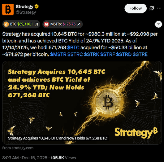 ล่าสุดประกาศเข้าซื้อ Bitcoin เพิ่มอีก 10,645 BTC ด้วยมูลค่ากว่า 980.3 ล้านดอลลาร์ หรือมีต้นทุนเฉลี่ยอยู่ที่ 92,098 ดอลลาร์ต่อเหรียญ
