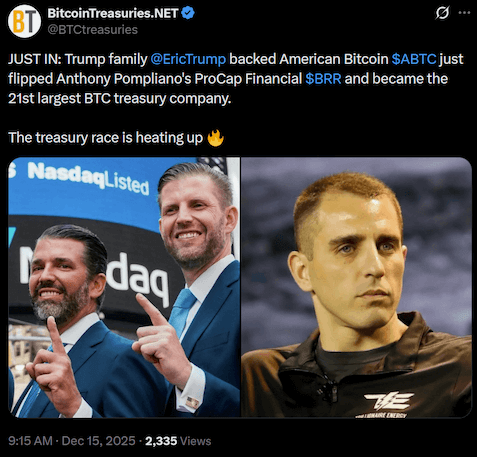 การแข่งขันสะสม Bitcoin ในระดับองค์กรทวีความดุเดือด ล่าสุด American Bitcoin ซึ่งได้รับการสนับสนุนจาก Eric Trump ได้แซงหน้า ProCap Financial ของ Anthony Pompliano ขึ้นแท่นบริษัทที่ถือครอง Bitcoin มากกว่า