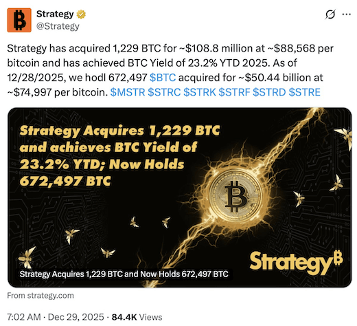 Strategy ปิดฉากปีด้วยการประกาศเข้าซื้อ Bitcoin เพิ่มอีก 1,229 BTC โดยมีราคาต้นทุนเฉลี่ยอยู่ที่ 74,997 ดอลลาร์ต่อเหรียญ