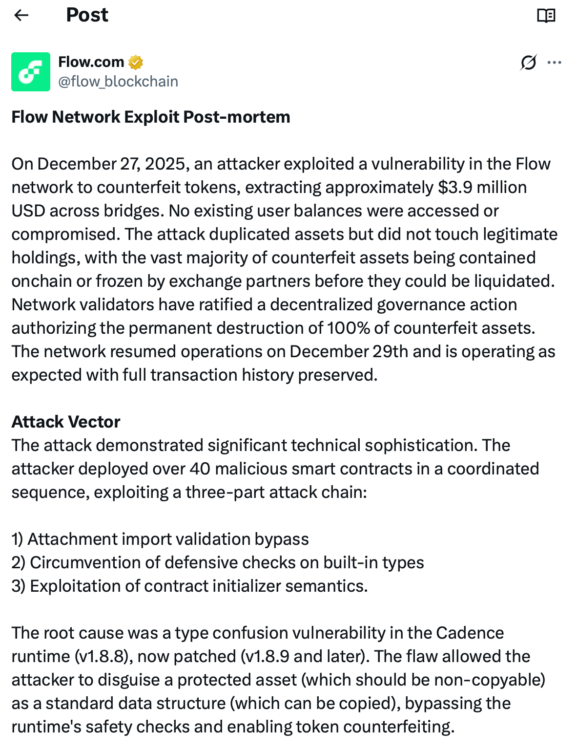 กลายเป็นประเด็นร้อนส่งท้ายปีเมื่อ Flow Foundation ออกมาชี้แจงเหตุการณ์เมื่อวันที่ 27 ธันวาคม 2025 ที่ผ่านมา โดยแฮกเกอร์อาศัยช่องโหว่ในระบบ Cadence runtime ทำการปลอมแปลงเหรียญขึ้นมาในระบบโดยไม่ต้องดึงเงินจากกระเป๋าใคร สร้างความเสียหายกว่า 3.9 ล้านดอลลาร์