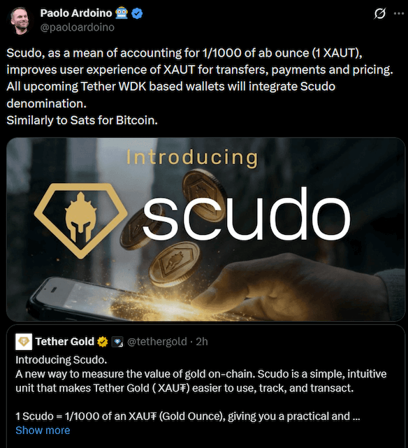 โดย Paolo Ardoino ซีอีโอของ Tether เปรียบเทียบว่า Scudo ก็เหมือนกับหน่วย Satoshi ของ Bitcoin ที่ถูกสร้างมาเพื่อให้ทองคำไม่ได้เป็นแค่ของสะสมในตู้เซฟ แต่สามารถนำมาใช้จับจ่ายใช้สอยบนโลกดิจิทัลได้จริง ลดข้อจำกัดเรื่องการจัดเก็บและการแบ่งหน่วยย่อย