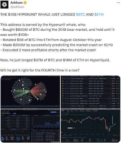 แพลตฟอร์มวิเคราะห์ Arkham ตรวจพบความเคลื่อนไหวของวาฬที่เคยสร้างกำไรมหาศาล $200 ล้าน จากการคาดการณ์ตลาดแครชจากสงครามภาษีสหรัฐฯ-จีนเมื่อเดือนตุลาคม ซึ่งกำลังเดิมพันครั้งใหม่ด้วยการเปิด Long Position มูลค่า $55 ล้านดอลลาร์ โดยแบ่งเป็น Bitcoin $37 ล้าน และ Ethereum $18 ล้าน บนแพลตฟอร์ม Hyperliquid