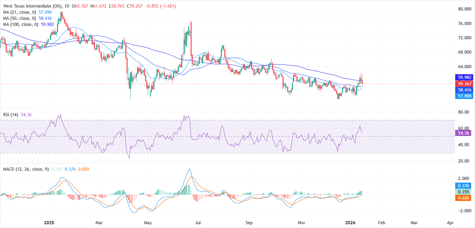 ในด้านลบ แนวรับทันทีอยู่ในโซน $59.00–$58.00 ซึ่งเส้นค่าเฉลี่ยเคลื่อนที่ระยะสั้นและกลางรวมตัวกัน การหลุดลงต่ำกว่าพื้นที่นี้อย่างต่อเนื่องจะเพิ่มแรงกดดันขาลงและอาจเปิดเผยพื้นที่แนวรับถัดไปใกล้ $56.00-$55.00