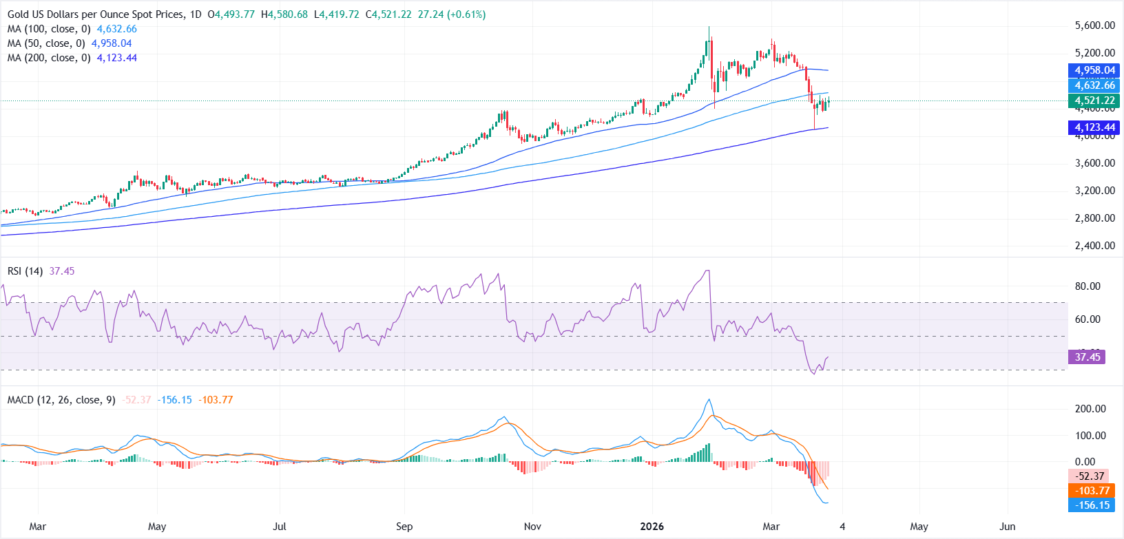 ในด้านขาขึ้น การทะลุเหนือเส้น SMA 100 วันที่ระดับประมาณ 4,633 ดอลลาร์อย่างชัดเจนอาจเปิดทางให้ราคาปรับตัวขึ้นสู่เส้น SMA 50 วันที่ราว 4,958 ดอลลาร์ ส่วนแนวรับทันทีอยู่ในโซน 4,400-4,300 ดอลลาร์ ตามด้วยเส้น SMA 200 วันที่ประมาณ 4,123 ดอลลาร์