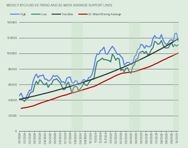 The report explained that Bitcoin might revisit the $100,000 level this month, potentially touching its long-term supportive zone — the 52-week average — as it has done several times in recent years, as shown in the chart below.