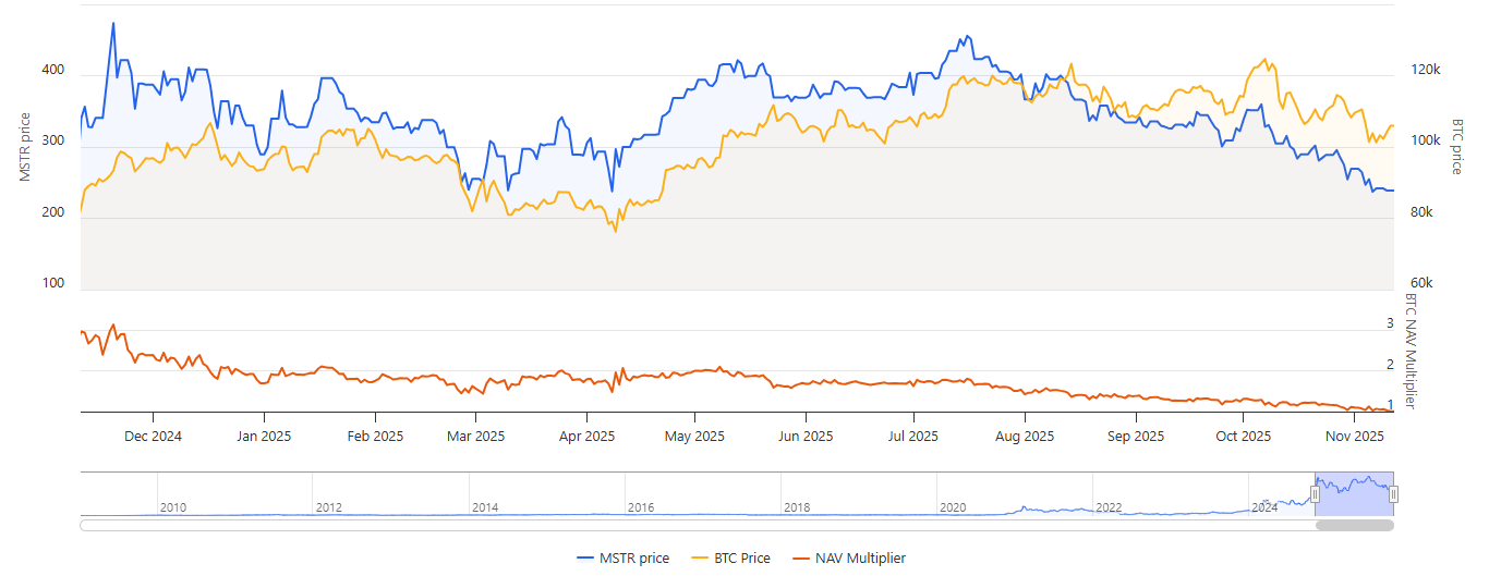 MSTR vs BTC vs mNAV. Source: BitcoinTreasuries.net