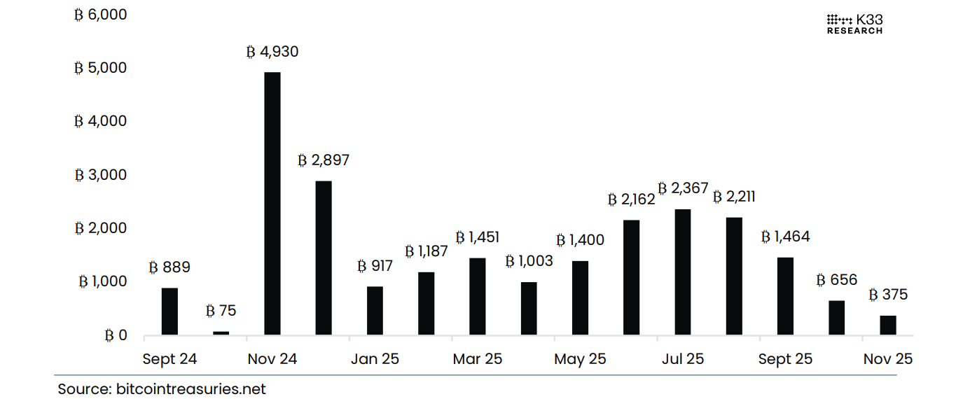 • Bitcoin average daily purchases by public companies reached a one-year low of 656 BTC in October, with demand plunging further in November.