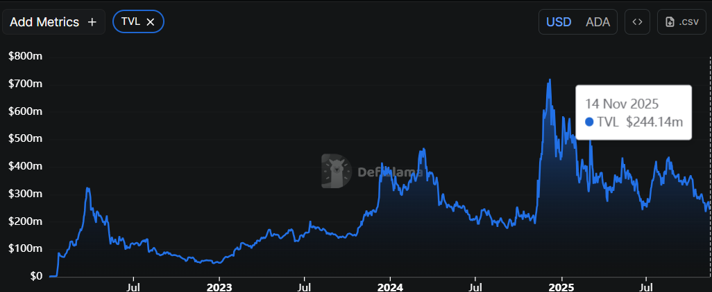 DefiLlama data shows that Cardano’s TVL dropped to $244.14 million on Friday and has been steadily declining since mid-August. Falling TVL signals weakening activity and waning user engagement in Cardano’s ecosystem, implying that fewer participants are depositing or interacting with ADA-based protocols, which doesn't bode well for its price.