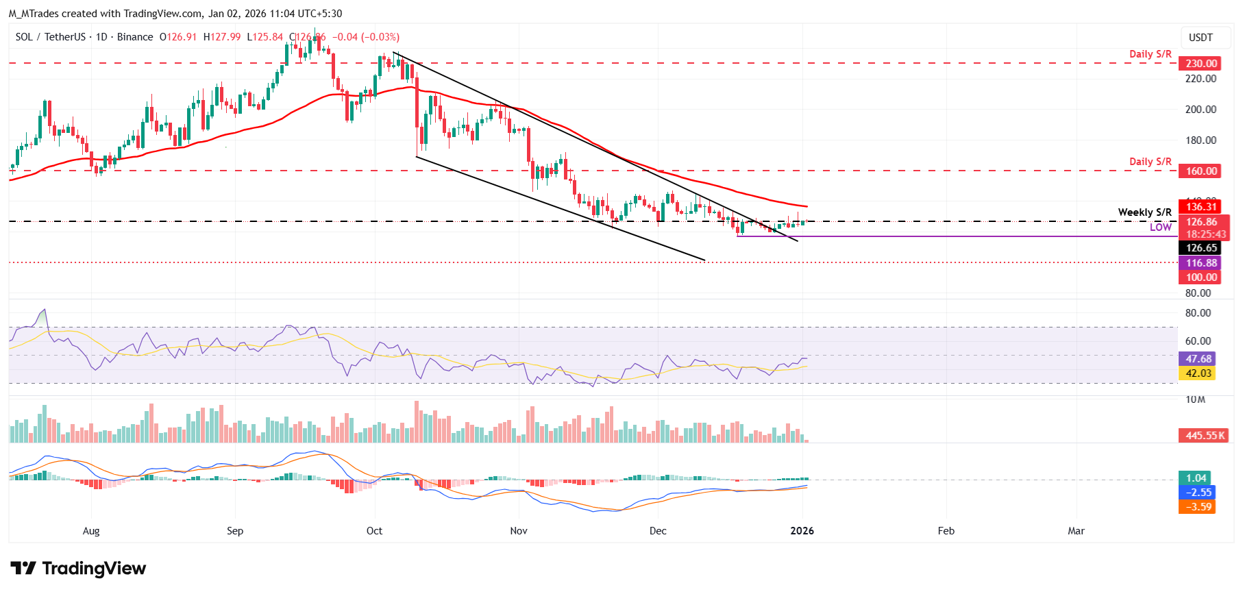 Solana price broke above the upper trendline of a falling wedge pattern (drawn by joining multiple highs and lows since early October) on December 26, rose slightly, but failed to close above the weekly resistance at $126.65 toward the end of December. On Thursday, SOL rose 2% and closed above this resistance level; as of Friday, it remains above $126.86.