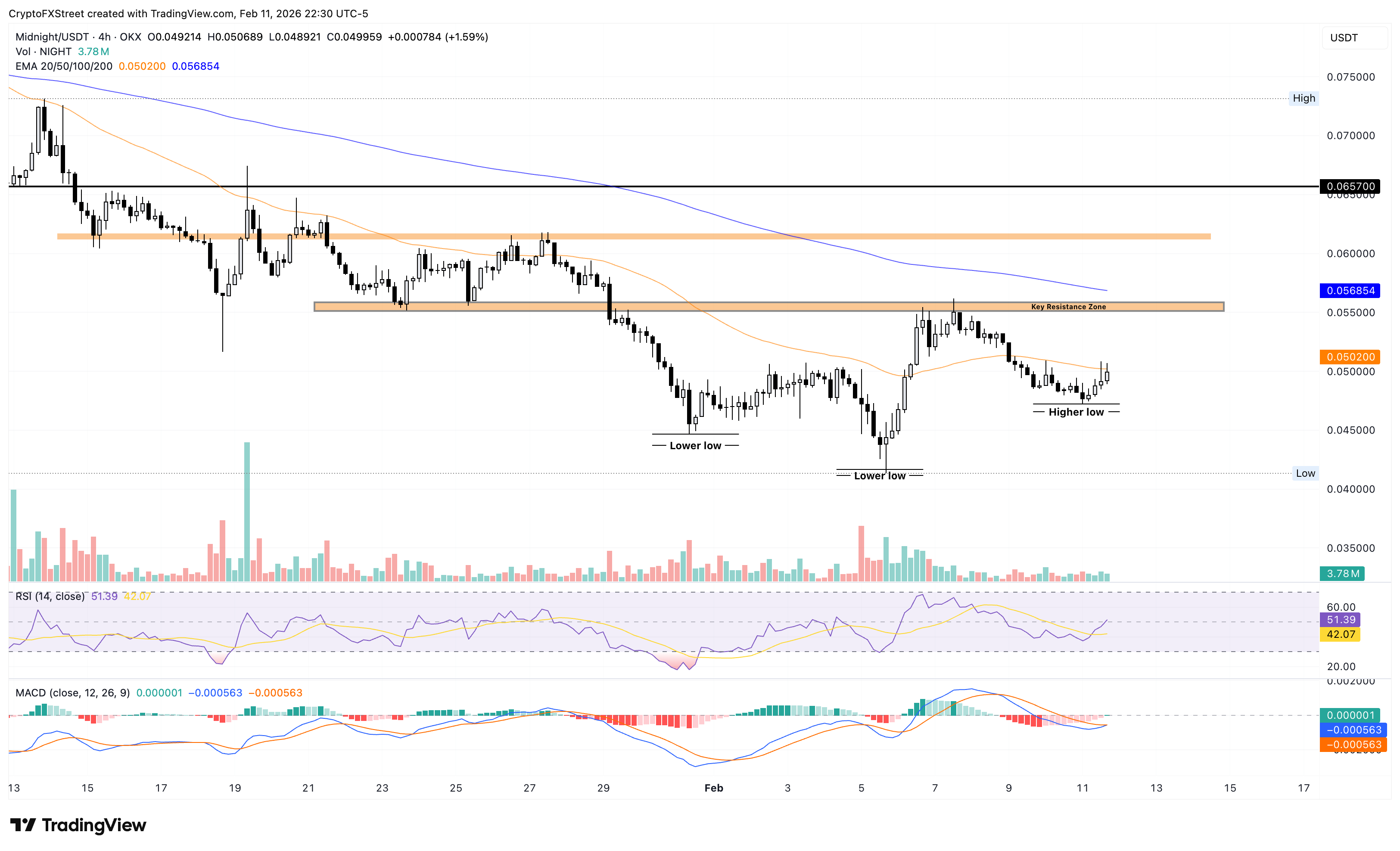 Midnight trades above the $0.0500 psychological level at the time of writing on Thursday, reflecting a minor recovery on the 4-hour chart. The NIGHT token's price action shows a higher low on the same chart after a series of lower lows, suggesting a potential trend reversal.