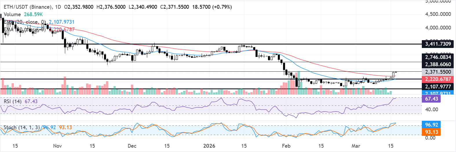 In the daily chart, ETH trades at $2,371 and is facing a potential rejection at $2,388. The near-term bias is mildly bullish as price pushes further above the 20-day Exponential Moving Average (EMA), while the 50-day average flattens and starts to act as a medium-term base.