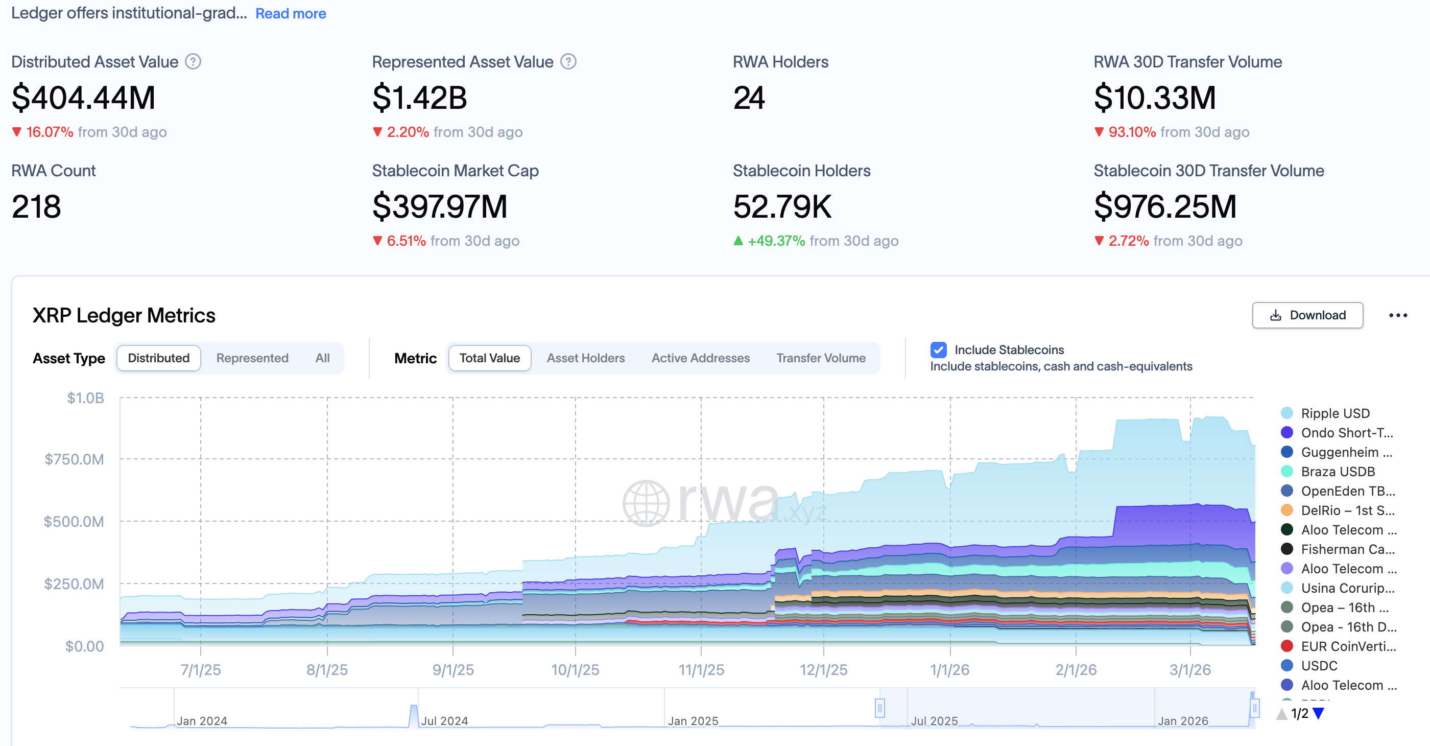 On the other hand, the RWAs are valued at $404 million on the ledger, excluding stablecoins such as $305 million in Ripple’s US Dollar-pegged RLUSD and other cash equivalents. Additionally, the number of stablecoin holders on Ripple has increased to 52,790, up nearly 50% in the last 30 days.