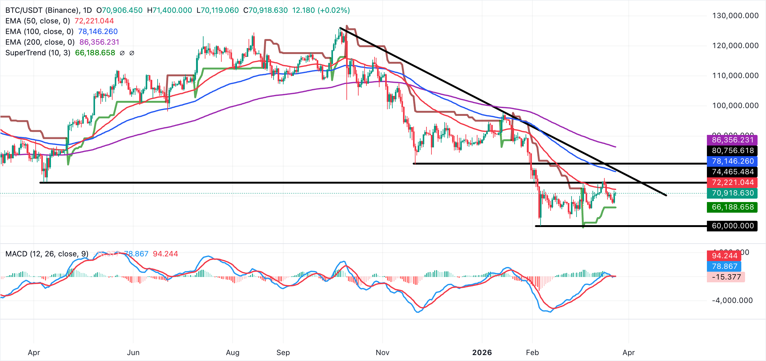 Immediate support lies near $70,000, aligning with the recent swing lows and sitting above the weekly open at $67,859. A sustained break below $67,859 would expose Bitcoin to the SuperTrend indicator's dynamic support at $66,188.