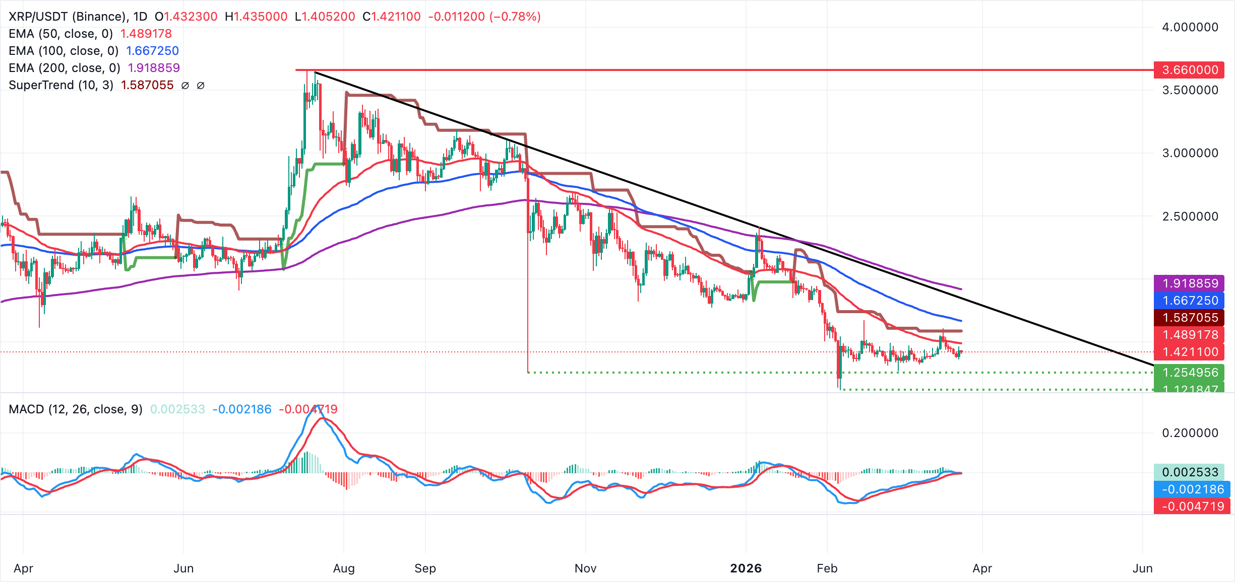 XRP is trading above $1.42, down from the daily high of $1.44. The remittance token aligns with a broader bearish trend, with the price capped well below the descending trendline resistance. Similarly, the 50-day, 100-day and 200-day EMAs, clustered between $1.49 and $1.92, appear to be limiting XRP's recovery potential