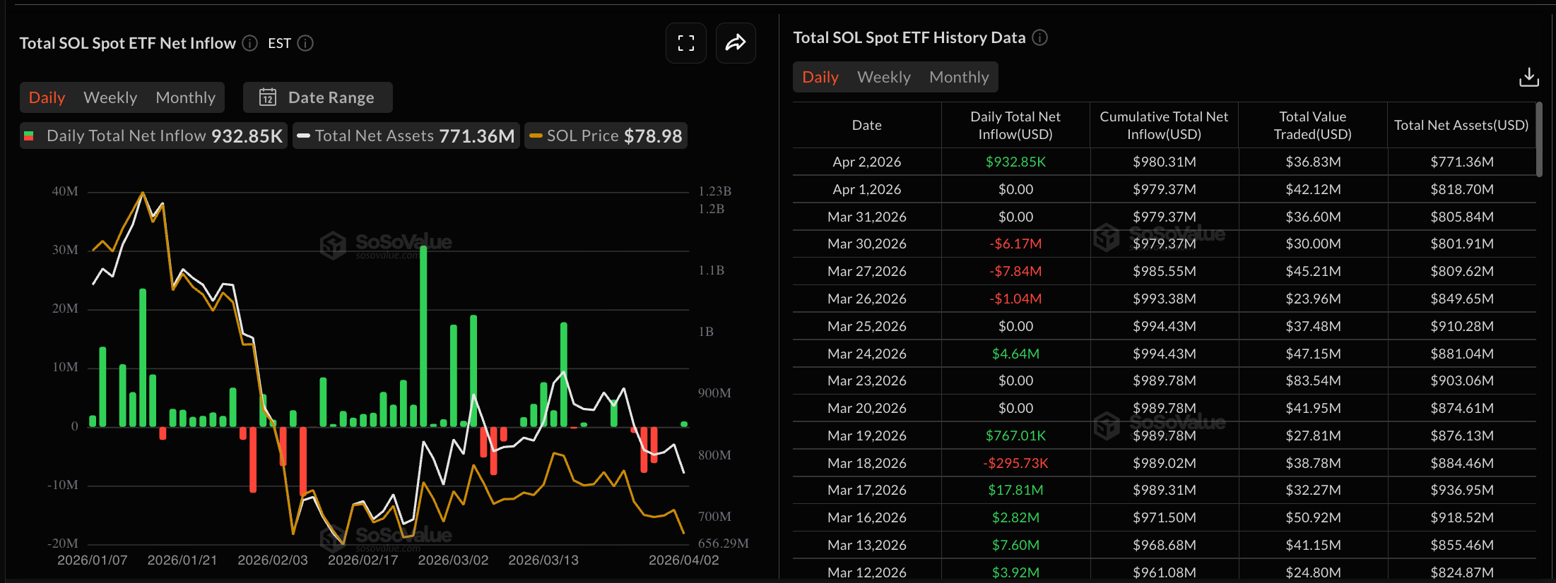 Institutional demand for Solana showed signs of recovery on Thursday, following an outflow of $6.17 million on Monday. The US spot Solana Exchange Traded Funds (ETFs) recorded $932,850 in inflows on Thursday, after two days of muted activity. This marks the first inflow since March 24, suggesting a potential new phase of institutional accumulation.