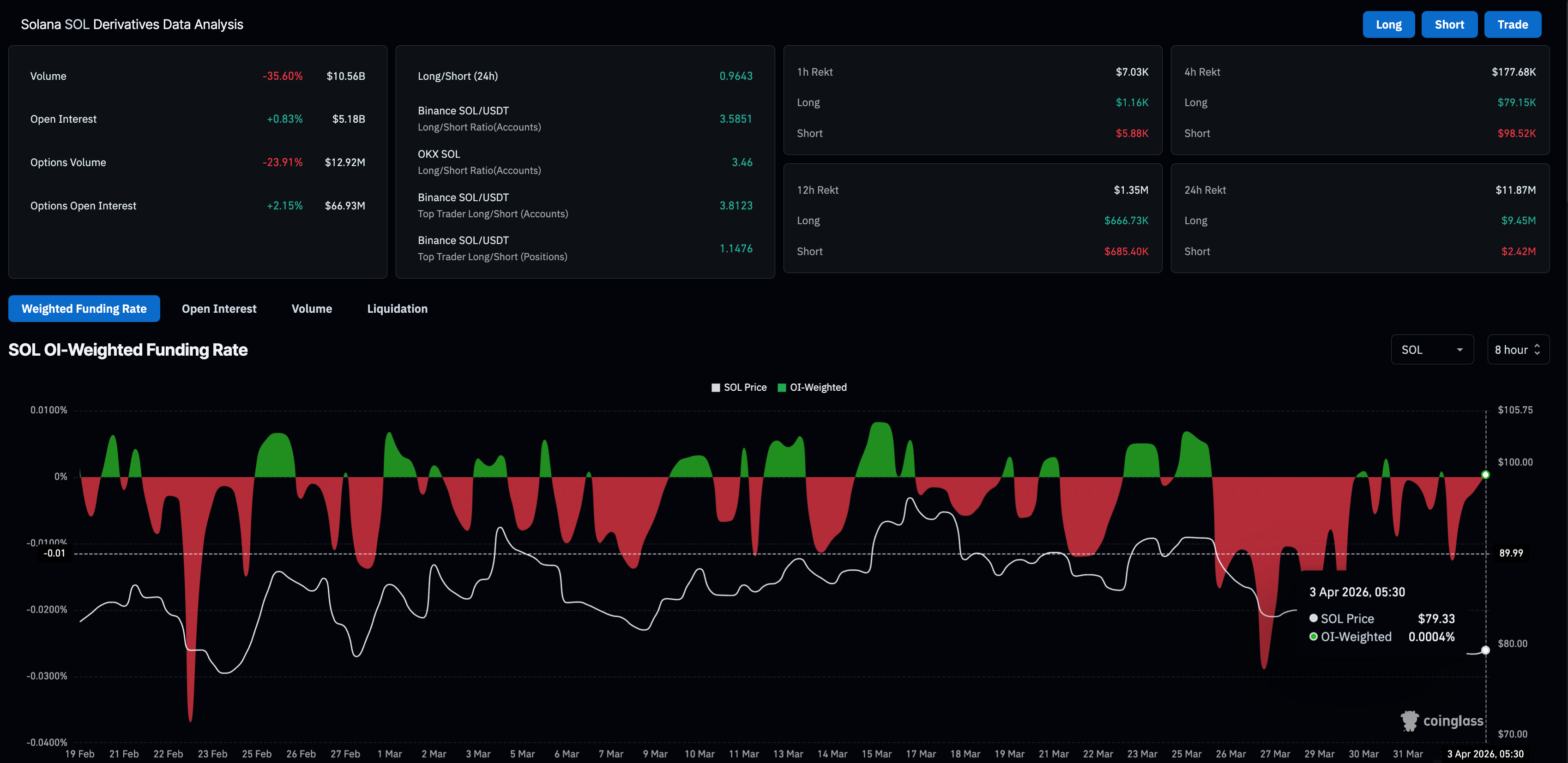 Bullish activity in Solana derivatives is on the back foot, as liquidations over the past 24 hours total $11.87 million, led by $9.45 million in long liquidations, indicating that bullish bets are being forced out amid a sharp spot price drop. Heightened long liquidations often lead to a positional imbalance due to a larger number of active short positions, as evidenced by the long-to-short ratio of 0.9643.