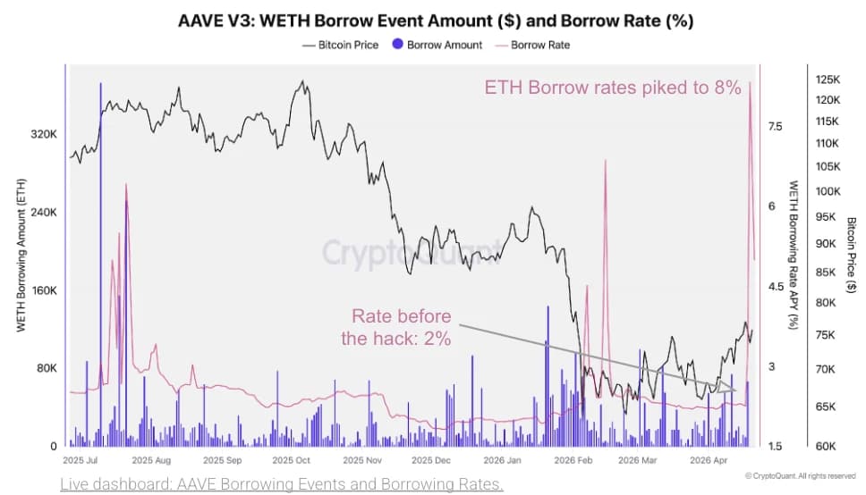 CryptoQuant states that “ETH borrowing rates spiked to 8%, the highest since at least January 2024, before stabilizing at approximately 5%, more than double the pre-hack level of 2%. ETH, USDC, and USDT are by far the three largest markets on AAVE.”