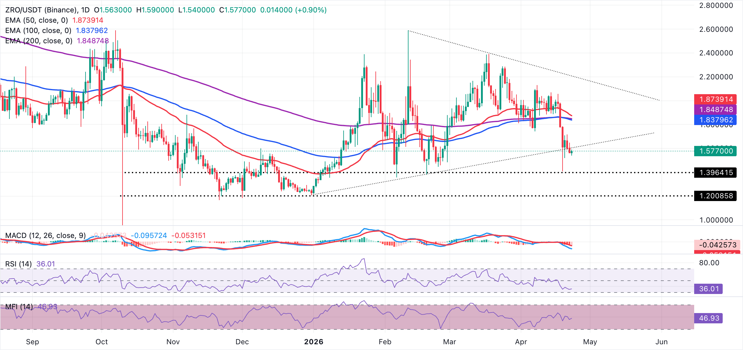 LayerZero trades at $1.58, extending its decline after losing the rising support trendline, which now caps the upside around $1.61. The price holds well below the 50-day, 100-day and 200-day Exponential Moving Averages (EMAs), reinforcing a bearish near-term bias as rallies are rejected beneath a dense band of overhead supply.