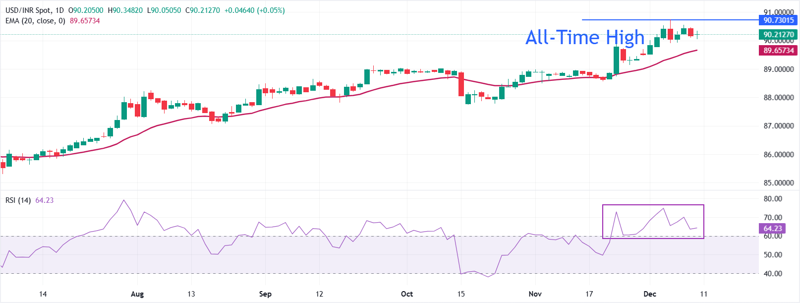 USD/INR เคลื่อนไหวแบนใกล้ 90.20 ในช่วงการซื้อขายในยุโรปเมื่อวันพุธ เส้นค่าเฉลี่ยเคลื่อนที่แบบเอ็กซ์โพเนนเชียล 20 วัน (EMA) ที่มีแนวโน้มสูงขึ้นที่ 89.6463 ยืนยันแนวโน้มขาขึ้นที่มั่นคง โดยราคายังคงอยู่เหนือเส้นนี้