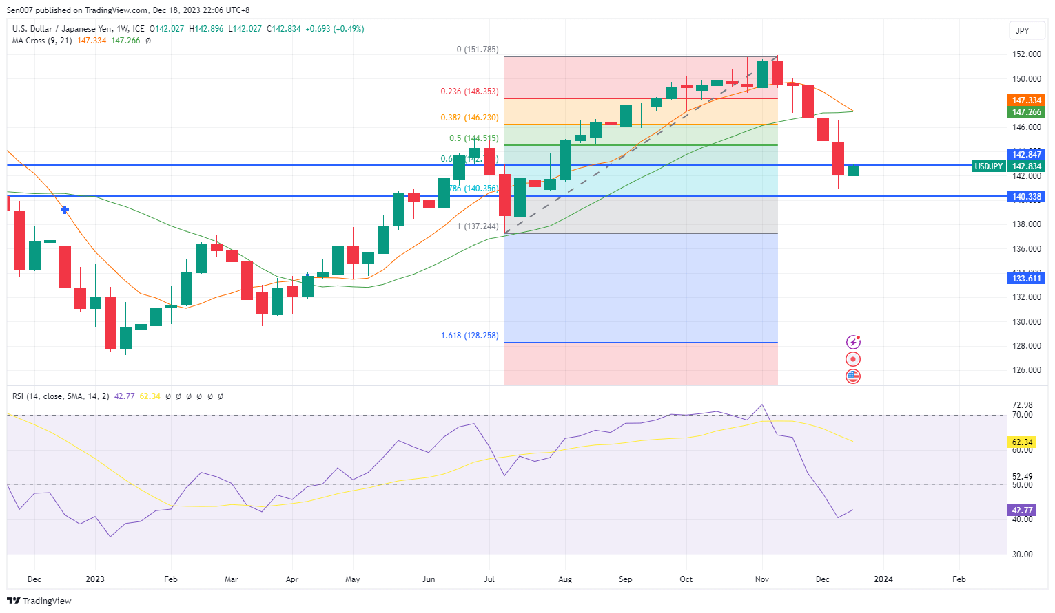 สัปดาห์ที่แล้ว เนื่องจากธนาคารกลางสหรัฐประกาศด้วยท่าที Hawkish ทำให้ USD/JPY ร่วงลง 1.9% ลดลงเป็นเวลาห้าสัปดาห์ติดต่อกัน ทั้งระดับเงินดอลลาร์สหรัฐและระดับหนี้ของสหรัฐสนับสนุนการแข็งค่าของเงินเยน