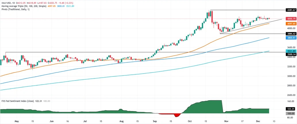 根據Valencia,由於美聯儲偏鴿,黃金可能首先飆升向4300美元/盎司;若突破該位,金價可能瞄準歷史高位4381。
