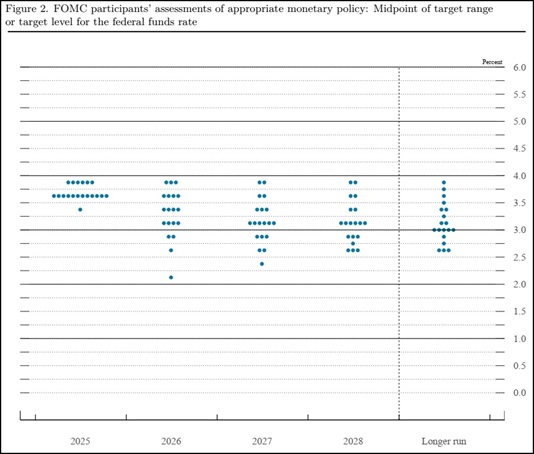 《經濟預測摘要》(SEP)公佈的「點陣圖」顯示,多數委員暗示明年的聯邦基金利率大約在3.4%左右,這意味着政策制定者明年可能會再降息25個基點。對於2028年以後更長期的利率水平,美聯儲官員認爲中性利率大約在3%。
