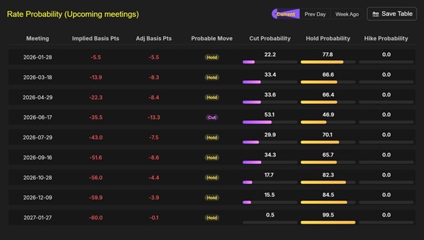 由於上週一系列經濟數據未能爲前景提供更多明確指引,交易員押注美聯儲將在2026年降息兩次。更寬鬆的貨幣政策對不付息的黃金和白銀構成利好。
