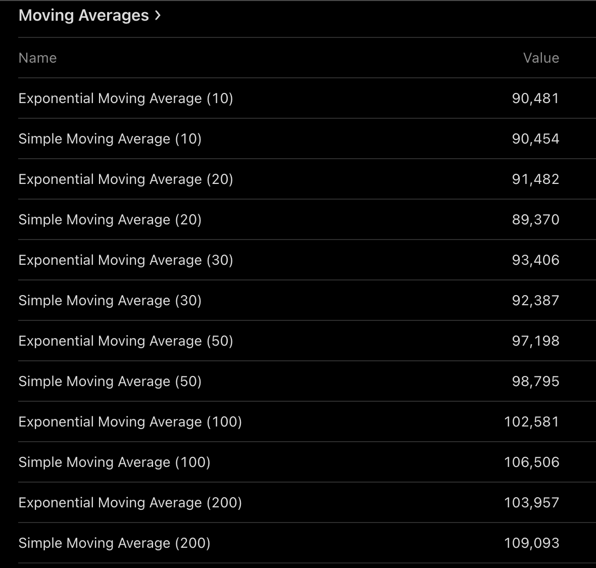 10日指數移動均線(EMA):90,481美元,10日簡單移動均線(SMA):90,454美元——均支持短期穩定
