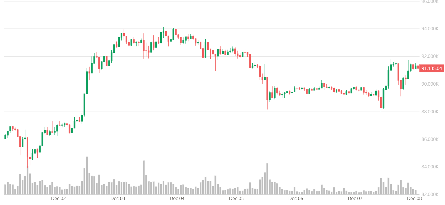 週一(12月8日)進入亞市,比特幣小幅上漲,重新回到90,000美元價格區間,交易員在等待美聯儲本年度最後一次的利率決策以及本週的最新就業數據。