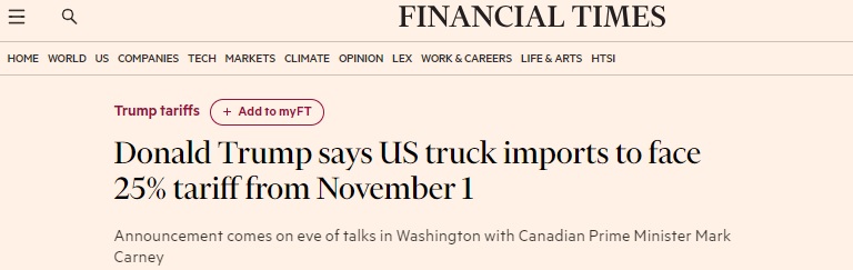 《金融時報》稱,特朗普曾在9月底表示,本月將對部分卡車進口徵收25%的關稅,但未能實施,這引發了人們對其對該政策承諾的質疑。週一他的聲明表明,他決心繼續推進。