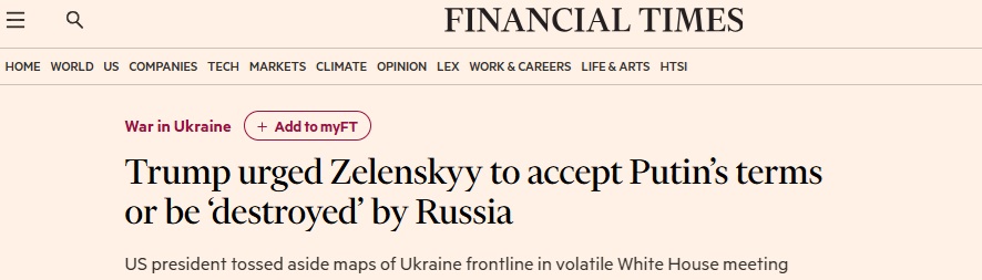 俄烏重大突發!金融時報:特朗普敦促澤連斯基接受普京的條件 否則將被俄「摧毀」