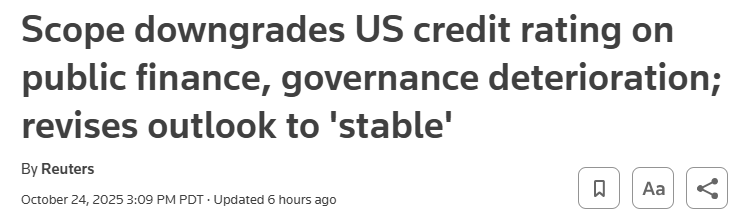 Scope在政府停擺伊始就曾發出警告,稱國會政治僵局和財政治理惡化已對美國評級展望構成風險。