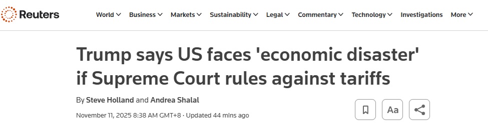 FX168財經報社(亞太)訊 英國路透社週二(11月11日)最新報道稱,美國總統特朗普(Donald Trump)週一表示,如果最高法院裁定他動用緊急權力法對幾乎所有國家徵收全面關稅的動議無效,美國將面臨經濟和國家安全災難。