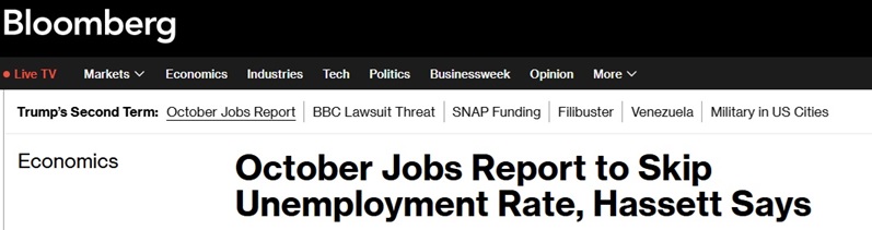 10月官方非農就業報告原定由美國勞工統計局在11月7日發佈,但由於政府關門,屬於未能發佈的衆多經濟數據之一。