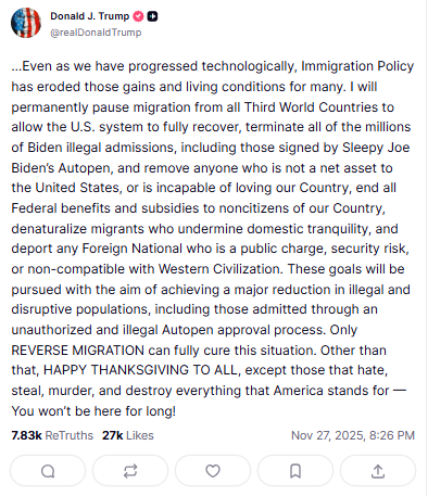 特朗普在 Truth Social 上寫道:「我將永久暫停來自所有第三世界國家的移民,讓美國體系得以全面恢復;終止拜登非法批准的數百萬案件,包括那些通過拜登自動簽名裝置批准的申請;並驅逐任何對美國不構成淨價值的人。」