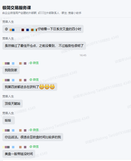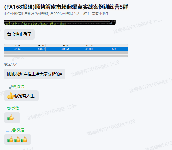 隨後,黃金走勢打破寂靜,率先靠近止盈點,那些觀看了當日策略視頻的同學,紛紛拍手慶祝,他們跟着老師的指導,終於吃到了久違的盈利。