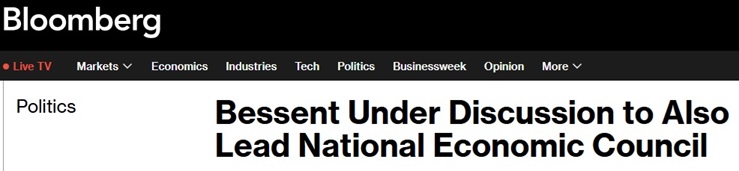 由貝森特出任白宮國家經濟委員會(NEC)主任,將使他在哈塞特(現任NEC主任)若出掌美聯儲後,能夠集中統籌特朗普的經濟政策。特朗普近日已暗示將發佈相關任命。