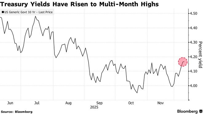 美國10年期國債收益率已從10月低點上升20多個基點。鑑於美聯儲可能在本週再度降息25個基點,這種現象頗爲反常。