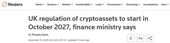 FX168財經報社(亞太)訊 英國路透社週一(12月15日)報道稱,英國財政部週一表示,英國將從2027年10月起開始對加密資產實施監管。政府希望新規既能爲行業提供確定性,同時把「可疑/不法參與者」(「dodgy actors」)拒之門外。