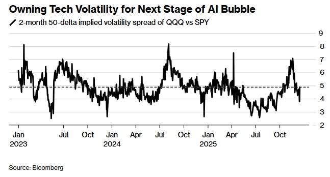 在瑞銀策略師看來,AI熱潮究竟延續還是破裂,是關鍵不確定性;因此,持有能夠從波動率上升中獲利、且以科技股爲主的納斯達克100指數相關合約,是同時「押兩邊」的核心做法。