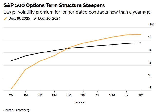他表示:「在曲線短端(期限較短的一端),來自散戶和機構的供給都很充足——QIS(量化投資策略)和波動率套息(vol carry)策略顯著增長,這種趨勢明年可能會進一步放大。而在曲線長端(期限較長的一端),對衝資金流將使長端維持在較高水平,因此可以預期期限結構會更陡峭。」