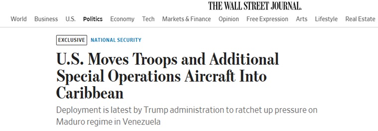 《華爾街日報》報道稱,一名美國官員表示,至少10架由特戰部隊使用的CV-22型「魚鷹」傾轉旋翼機12月22日晚從美國新墨西哥州坎農空軍基地飛抵加勒比地區。根據飛行跟蹤網站數據,同一天,來自佐治亞州斯圖爾特堡和肯塔基州坎貝爾堡陸軍基地的C-17運輸機抵達波多黎各。另一名美國官員證實,這些飛機上載有美軍人員和裝備。