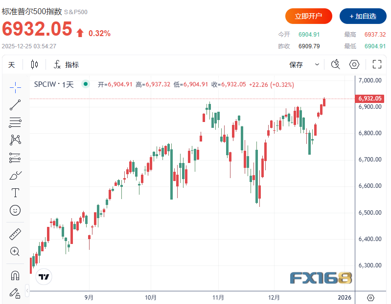 FX168財經報社(北美)訊 週三(12月24日),美股三大指數再度齊創歷史新高,標普500指數刷新收盤紀錄,市場在強勁經濟數據與「聖誕老人行情」預期支撐下延續年末漲勢。與此同時,聖誕前夕交投清淡、成交量顯著降溫,令指數走勢呈現「穩步推升」節奏。部分機構認爲,若短期缺乏負面消息擾動,標普500指數年內仍有望衝擊7000點關口,併爲2026年開局奠定強勢基調。