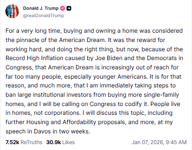 特朗普在Truth Social發文稱:「長期以來,買房與擁有住房被視爲美國夢的巔峯——它是努力工作、做正確事情的回報。但如今,美國夢正越來越遙不可及,尤其是對年輕美國人來說。」他補充稱:「正因如此,以及更多原因,我將立即採取措施,禁止大型機構投資者購買更多獨棟住宅,並將呼籲國會將其立法固定下來。房子是給人住的,不是給公司買的。
