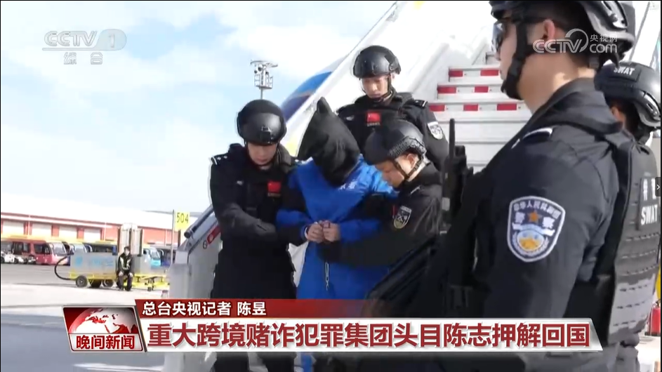 央視畫面顯示,陳志戴着頭套、雙手被銬,在身着黑色制服的特警押解下從飛機舷梯走下,央視並將其稱爲「重大跨國賭博詐騙犯罪集團的首要分子」。中方同時表示,相關部門已對陳志採取強制法律措施,案件仍在進一步偵辦中,並將公佈「陳志犯罪集團」重要成員的通緝名單,敦促相關人員儘快投案自首。